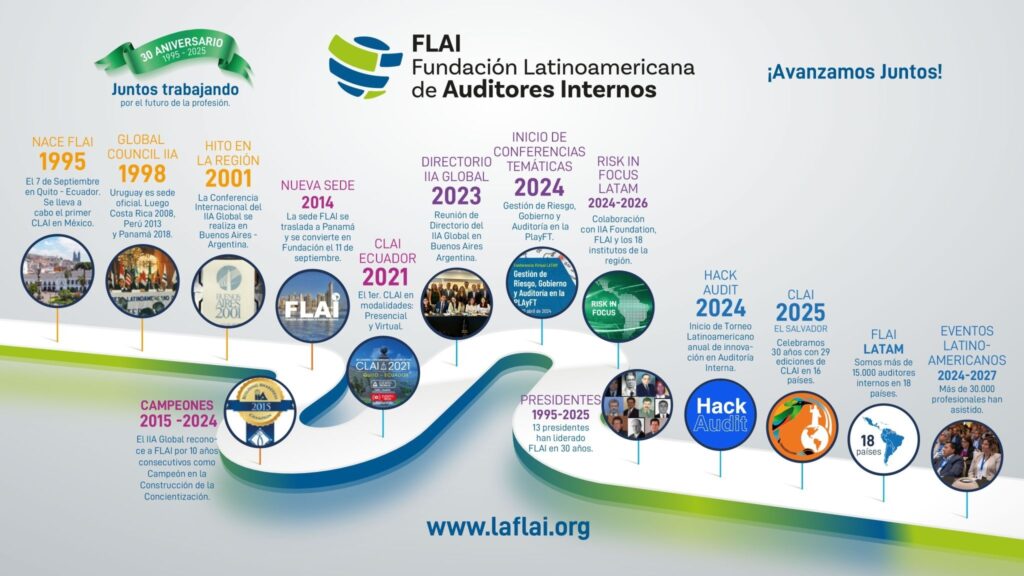 Nuestra visión es ser la organización líder que agrupe a todos los profesionales de la actividad de auditoría interna en Latinoamérica, promoviendo las mejores prácticas que ayuden al mejoramiento de la eficacia de los procesos de gestión de riesgos, control y gobierno corporativo, manteniendo un alto nivel de excelencia, que permita ofrecer a sus miembros un servicio de clase mundial.